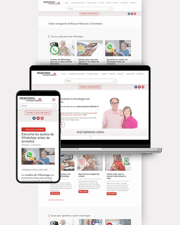Mi recorrido en capacitación tecnológica comenzó en 2017, gestionando los contenidos de Mayores Conectados, un espacio dedicado a la alfabetización digital de adultos mayores.